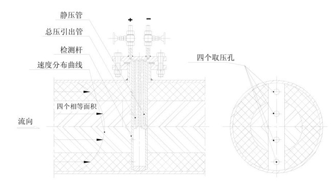 均速管流量計是基于皮托管測速原理發展起來的,它是通過管道的平均流速及管道的有效截面積的乘積來確定流量的。一般管道中的流速分布是不均勻的。如果是充分發展的流體,其速度分布為指數規律。為了準確計量,將整個圓截面分成四個單元面積相等的兩個半圓及兩個半環。均速管流量計的檢測桿是由一根中空的金屬管組成,布置在垂直于流向的工藝管道中,迎流面鉆兩對總壓孔,分別處于各單元面積的中央,它們分別反映了各單元面積的流速大小。由于各總壓孔是相通的,傳至檢測桿中的各點總壓值平均后,由總壓引出管經高壓接頭,送到變送器的正壓室。當均速管流量計正確安裝在有足夠長度直管段的工藝管道上時,流量截面上應沒有旋渦,整個截面的靜壓可認為是常數。在檢測桿的背面中間設有一個檢測孔,代表了整個截面的靜壓。經靜壓引出管由低壓接頭引至變送器的負壓室,正、負壓室測得的差壓的平方與流量截面的平均流速成正比,從而獲得差壓與流量成正比的關系。