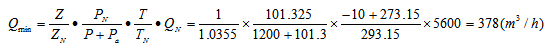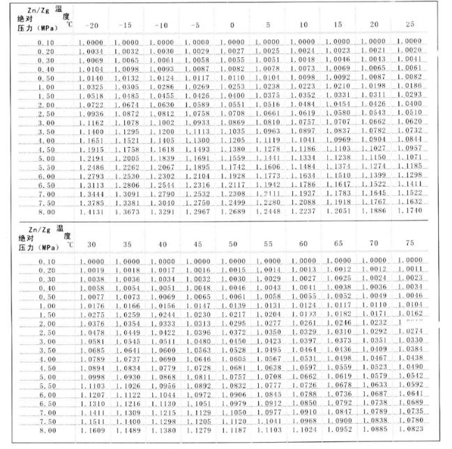 式中:T、P、Pa含義同上,Q為體積流量,Qn為標準體積流量,Z/Zn數值列于表2.因計算步長較大,表內數據僅供參考,表中數據按天然氣真實相對密度Gr=0.600,氮氣和二氧化碳摩爾分數均為0.00計算。當介質壓力低于0.1MPa,均可按Z/Zn=1估算。