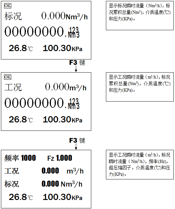 5.1.2瞬時流量可切換顯示標況體積流量(Nm3/h)和工況體積流量(m3/h),最多可保留3位小數,顯示 值為9999999;